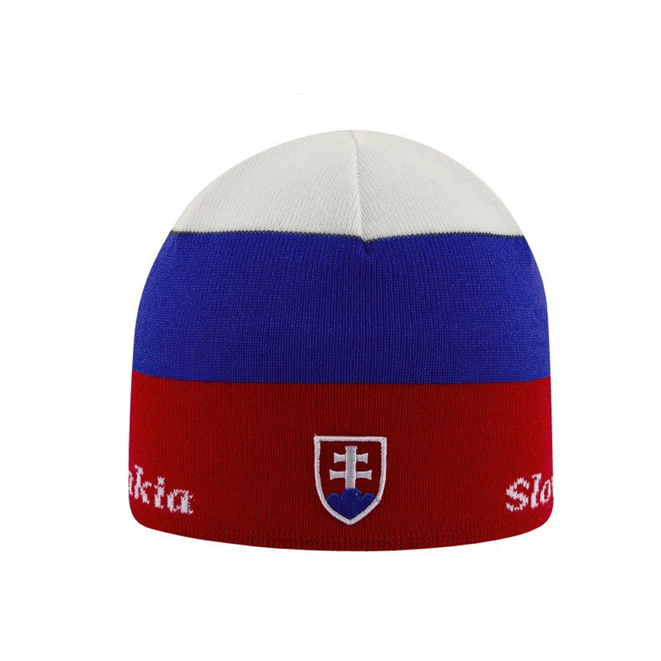 Tenšie pletená čiapka vo farbách slovenskej trikolóry a vpredu s nášivkou Slovenského znaku.