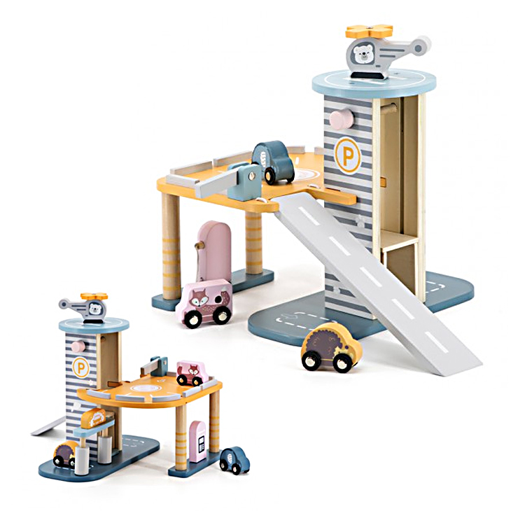 Drevená hračka-garáž s pristávacou plošinou pre vrtuľník. Súčiastky na obrázku sú súčasťou balenia.