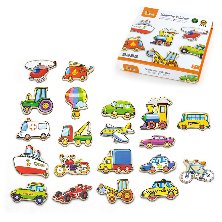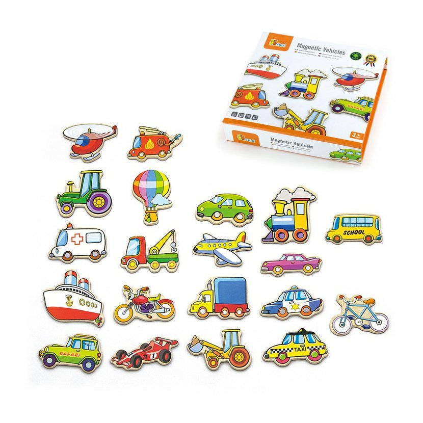 Sada farebných drevených magnetiek vhodná na každú chladničku. Sada obsahuje 20 rôznych magnetiek s obrázkami dopravných prostriedkov.
